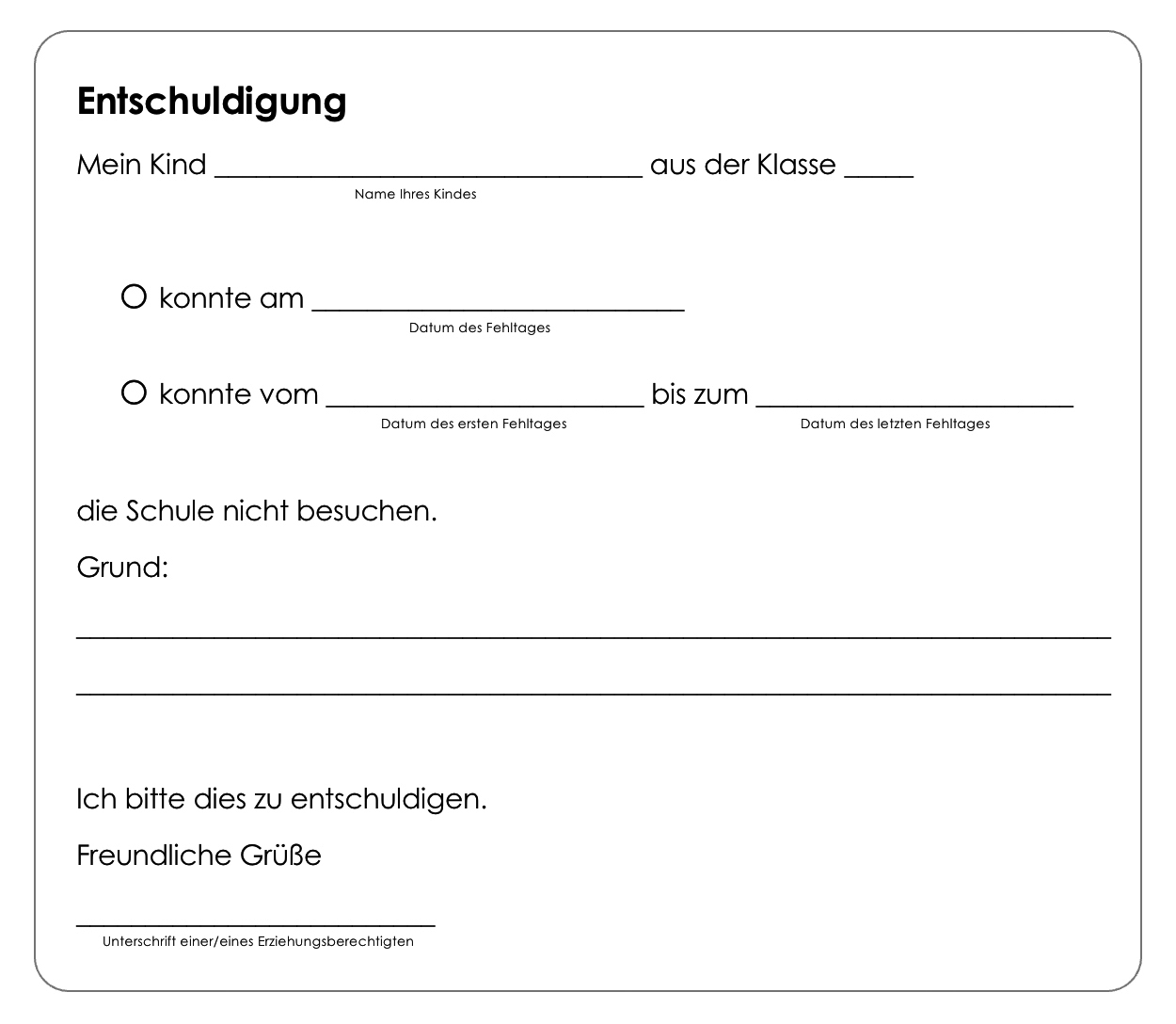 Bitte beachten Sie, dass Ihr Kind immer schriftlich mit Unterschrift entschuldigt werden muss. Spätestens am dritten Fehltag muss eine schriftliche Entschuldigung der Klassenlehrkraft übermittelt werden.
